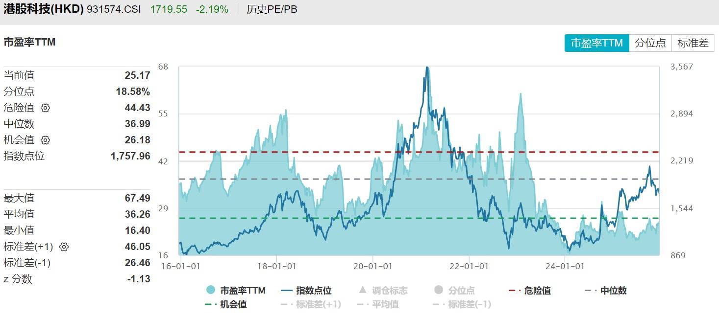 然而,连续回调后,港股科技板块估值吸引力再现。截至最新,港股科技指数最新估值25.17倍PE(TTM),处于较低区域;横向比较来看,显著低于A股创业板指(约40倍PE)和美股纳斯达克指数(约41倍PE),在全球主要科技股指中具备明显的估值优势。