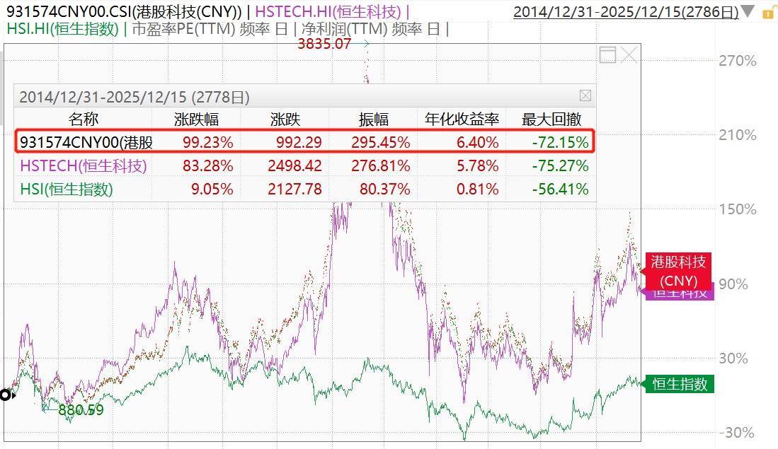 覆盖“中国十大科技股”(阿里巴巴、京东集团、吉利汽车、比亚迪股份、小米集团、腾讯控股、网易、百度集团、美团和中芯国际)的港股科技指数(931574)相对恒生科技指数表现更优。港股科技指数(CNY)自基日2014年12月31日至2025年12月15日,累计涨幅99.23%,同期恒生科技指数涨幅83.28%。